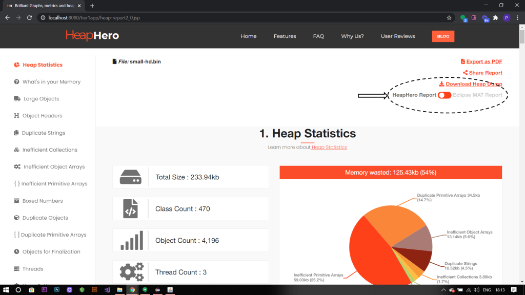 You can also configure HeapHero to analyze heap dumps using both it’s internal engine and Eclipse MAT. When you launch the HeapHero in this mode, you will notice the ‘HeapHero – Eclipse MAT’ toggle button in the heap analysis report page (as shown in the below image).